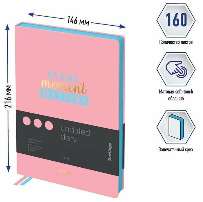 Ежедневник недатированный Berlingo А5, 160 листов, Haze, розовый срез, мятный, с рисунком UD2_95502