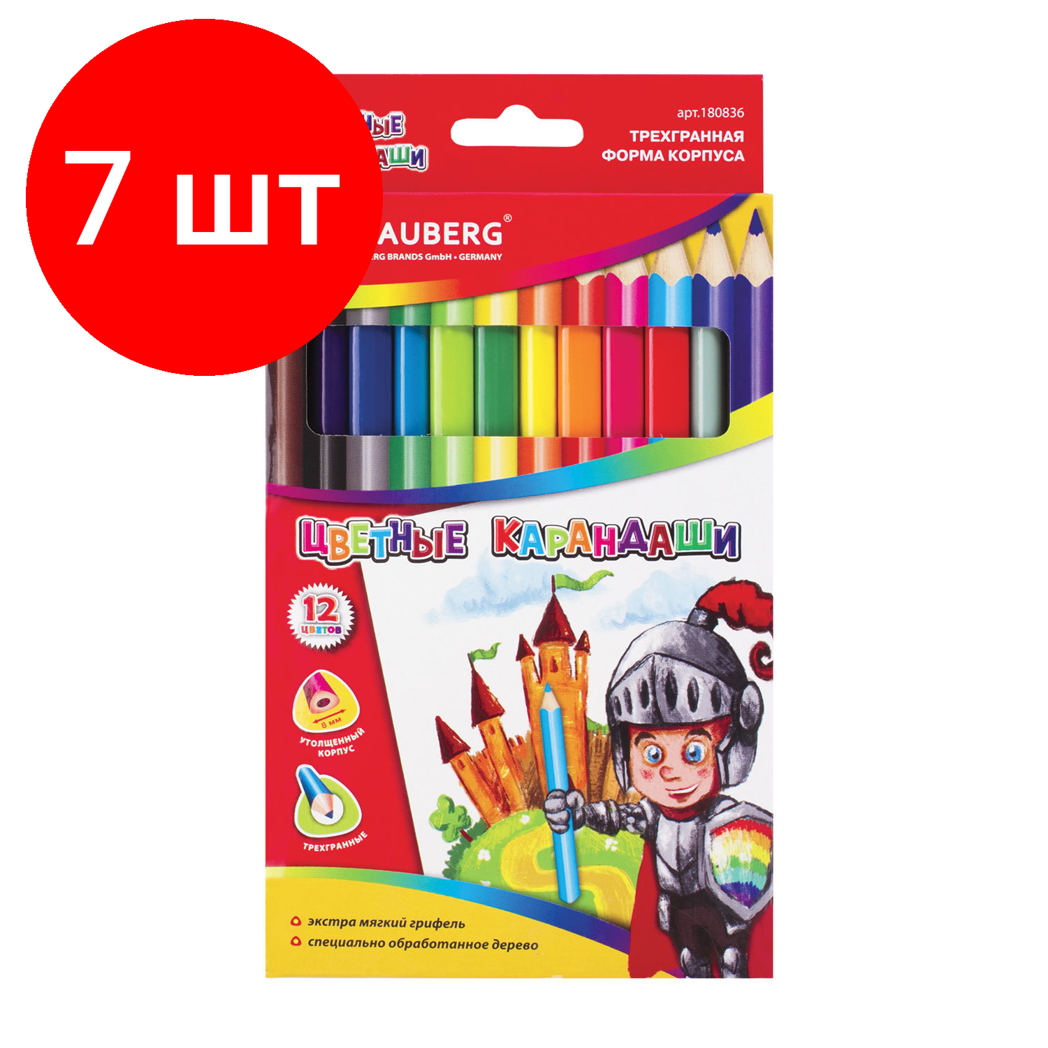 Купить Комплект 7 шт, Карандаши цветные утолщенные BRAUBERG, 12 цветов, трехгранные, картонная упаковка, 180836