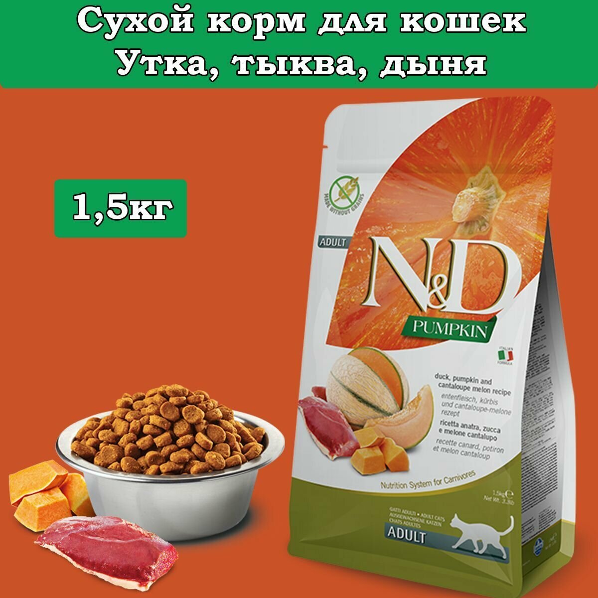 Farmina N&D Cat Pumpkin Duck&Cantalupe Adult корм для взрослых кошек Утка, тыква и дыня, 1,5 кг.