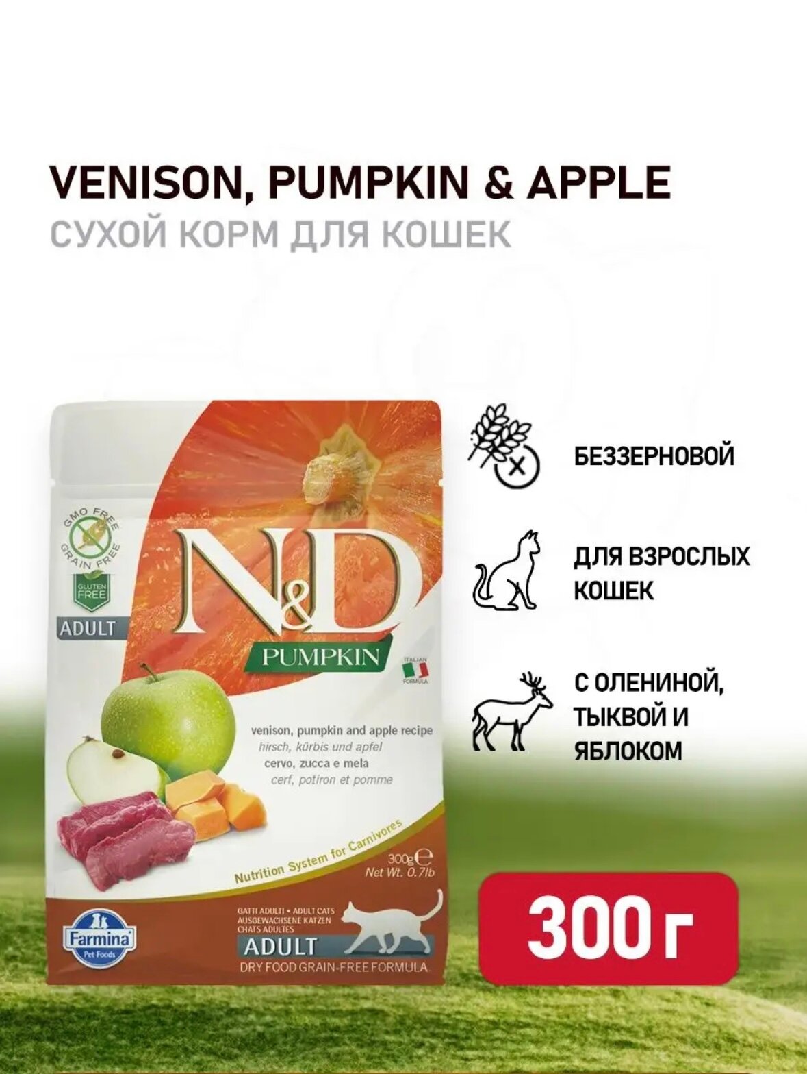 Сухой корм для взрослых кошек Farmina N&D Pumpkin, беззерновой, с олениной, с тыквой, с яблоком 300 г