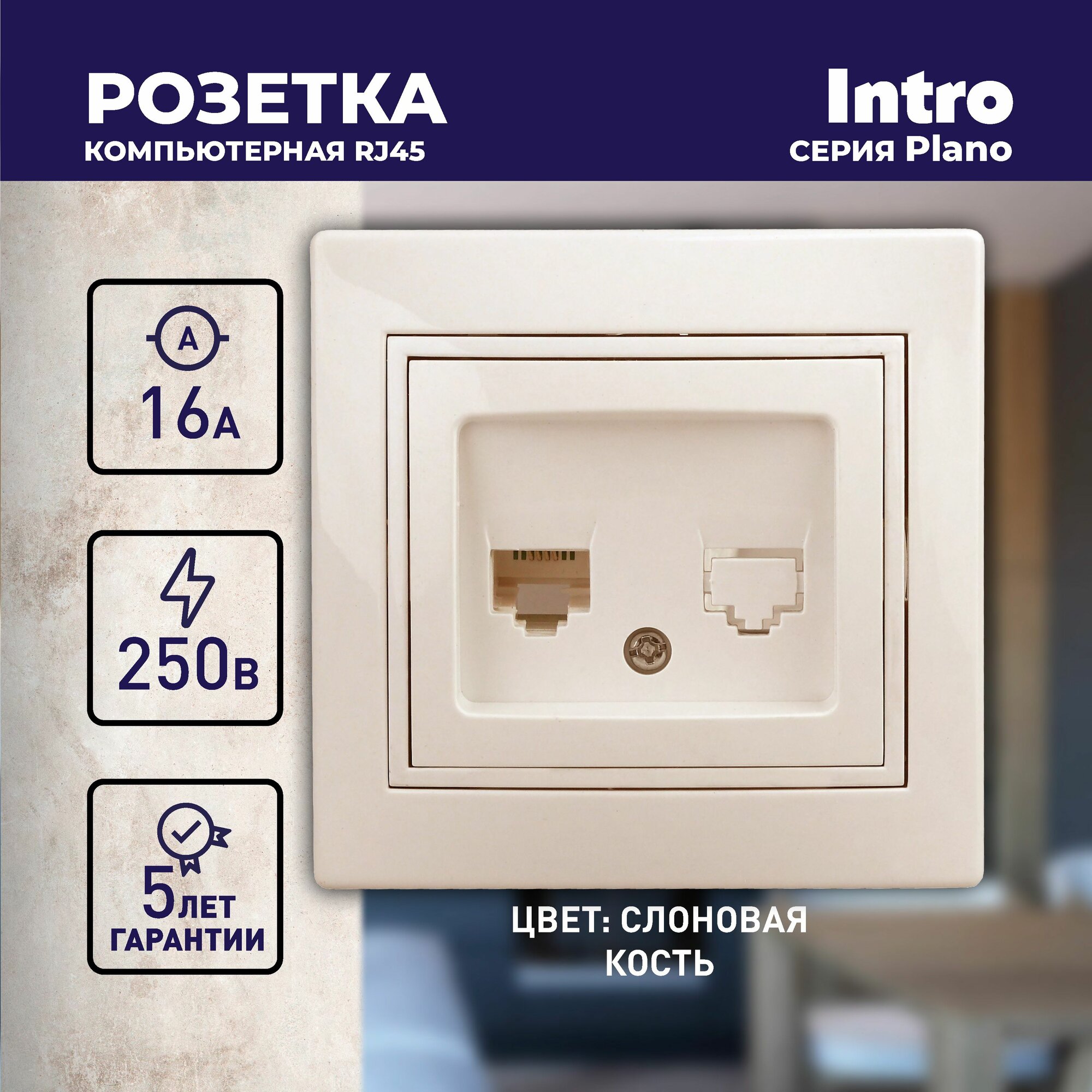 Розетка компьютерная Intro Plano 1-303-02 RJ45 скрытой установки слоновая кость