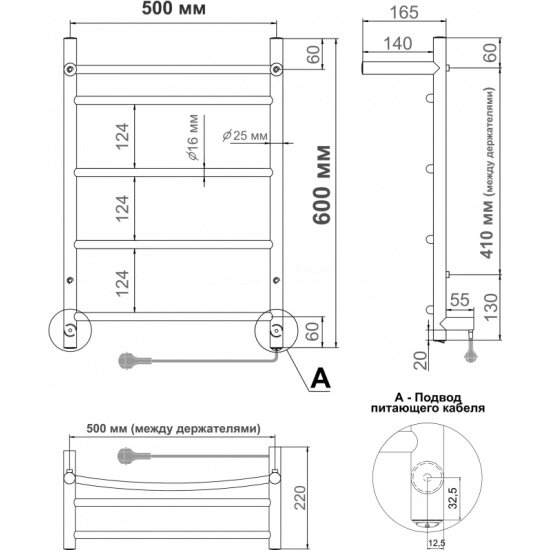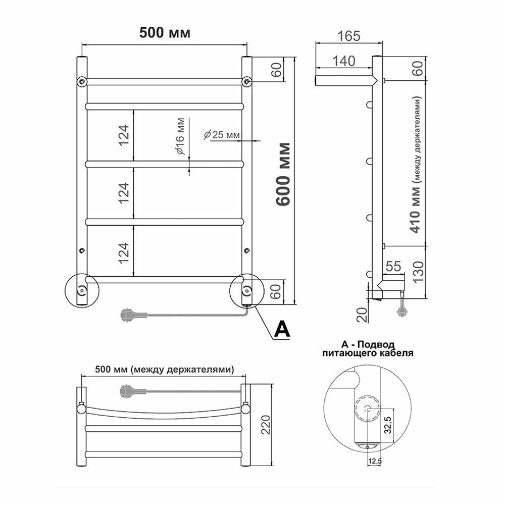 Полотенцесушитель Электрический Тругор Пэк сп 5 П 60х50 черный ВГП