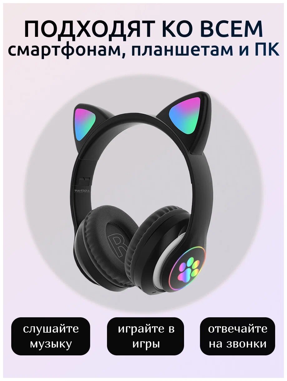 Наушники ушки кошачьи беспроводные Bluetooth светящиеся детские c ушками кошечки черный