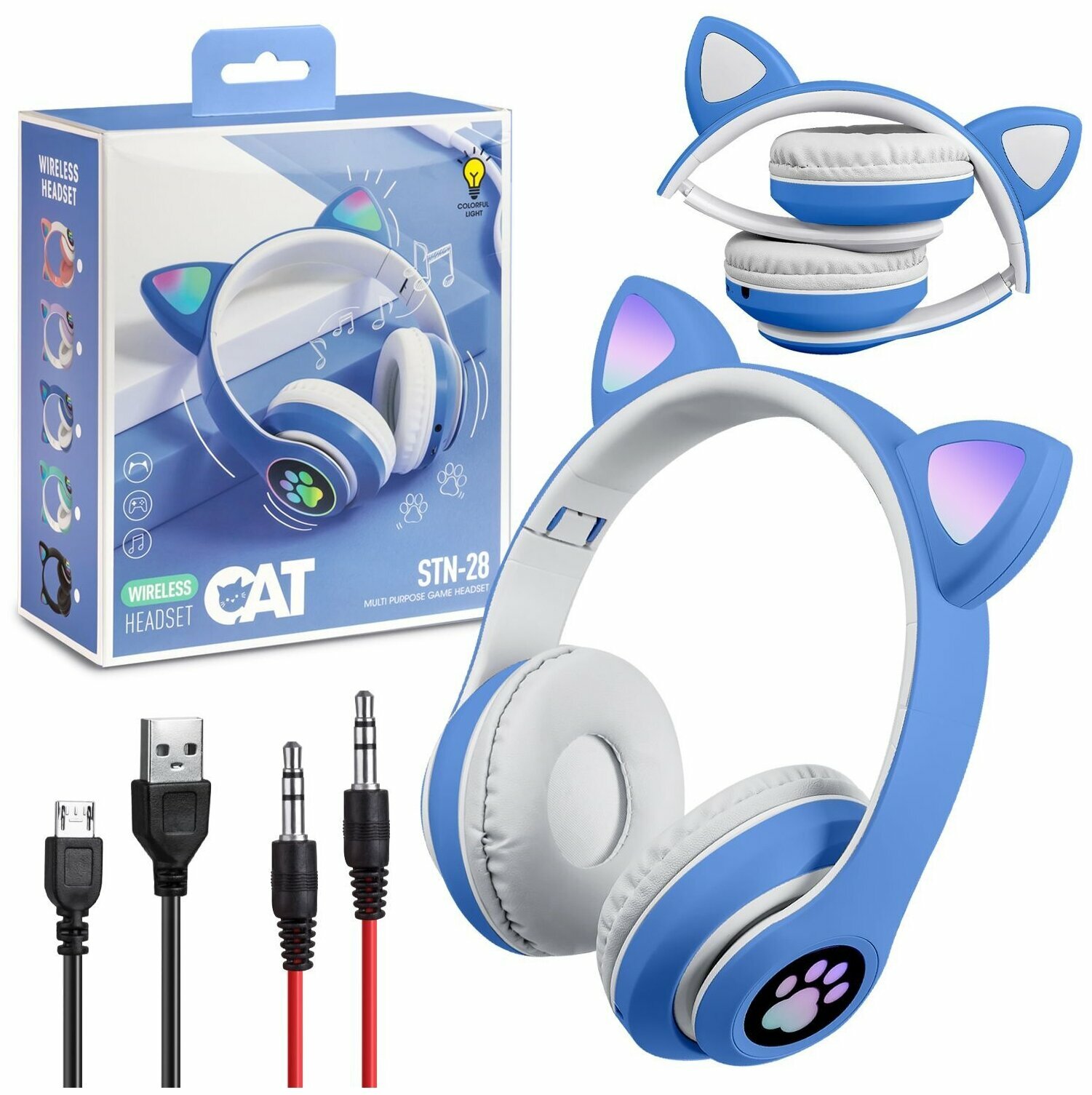 Беспроводные наушники Bluetooth CAT STN-28 со светящимися кошачьими ушками и лапками, детские (Синие)