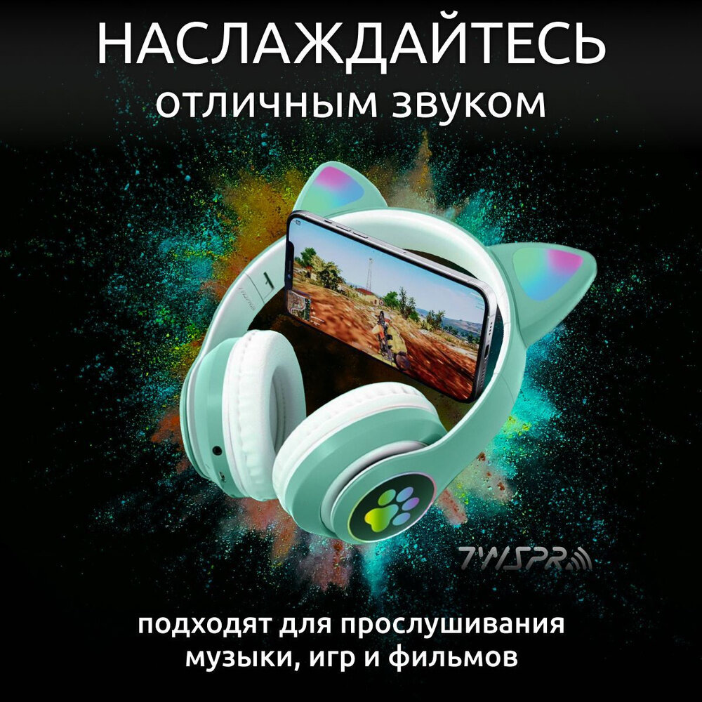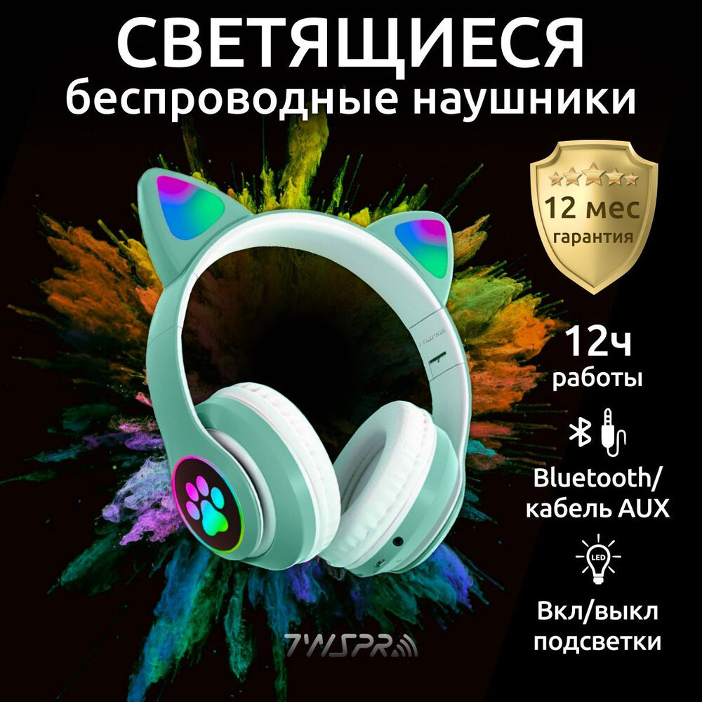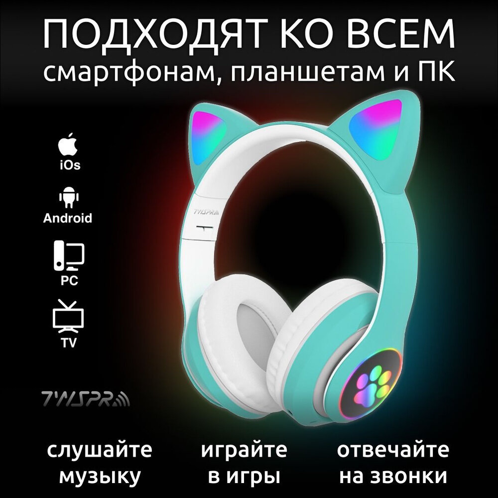 Купить Наушники беспроводные детские с ушками / Светящиеся детские беспроводные наушники с ушками / Беспроводные наушники детские / Наушники с ушами мятные