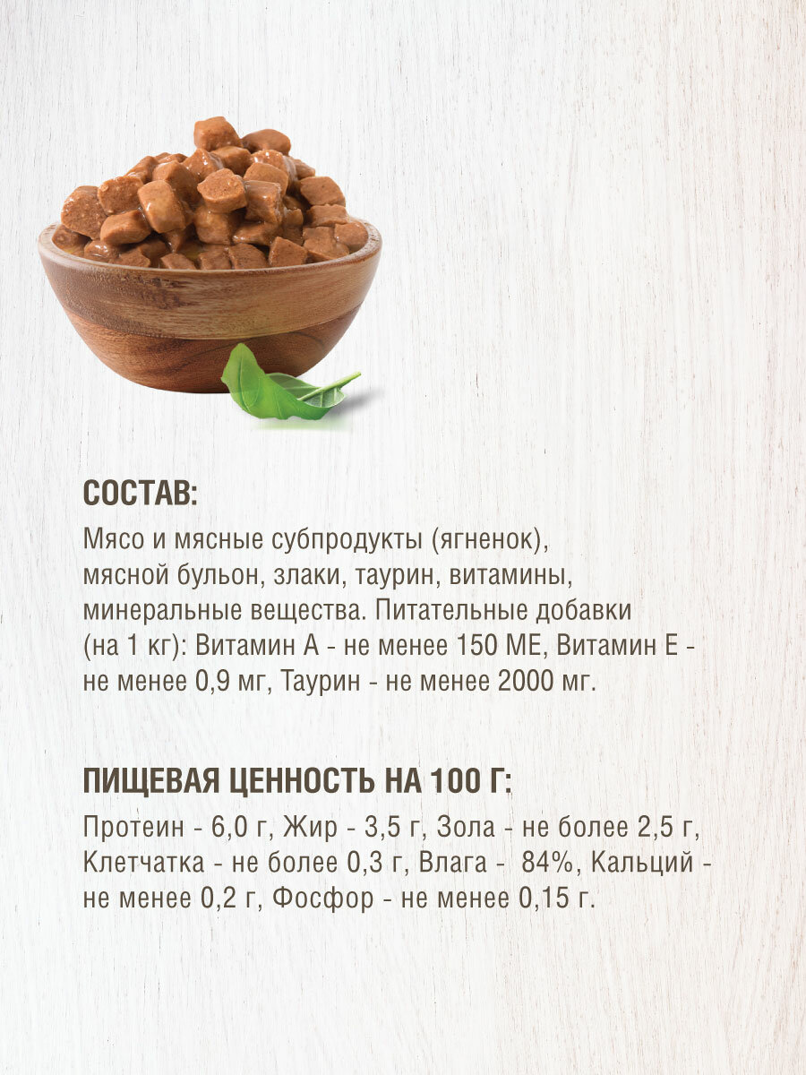 | Состав | мясо и мясные субпродукты (ягненок не менее 4%), мясной бульон, злаки, таурин, витамины, минеральные вещества. |