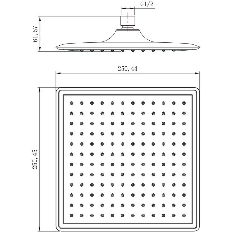 Лейка душевая верхняя квадратная 250х250мм, хром