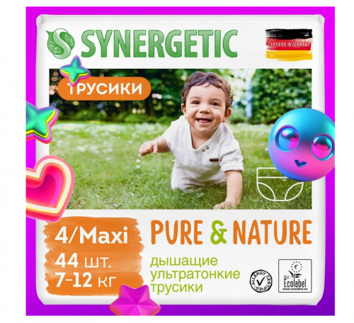 Трусики-подгузники SYNERGETIC PURE&NATURE Ультратонкие, дышащие, размер 4 MAXI (7-12 КГ), 44шт