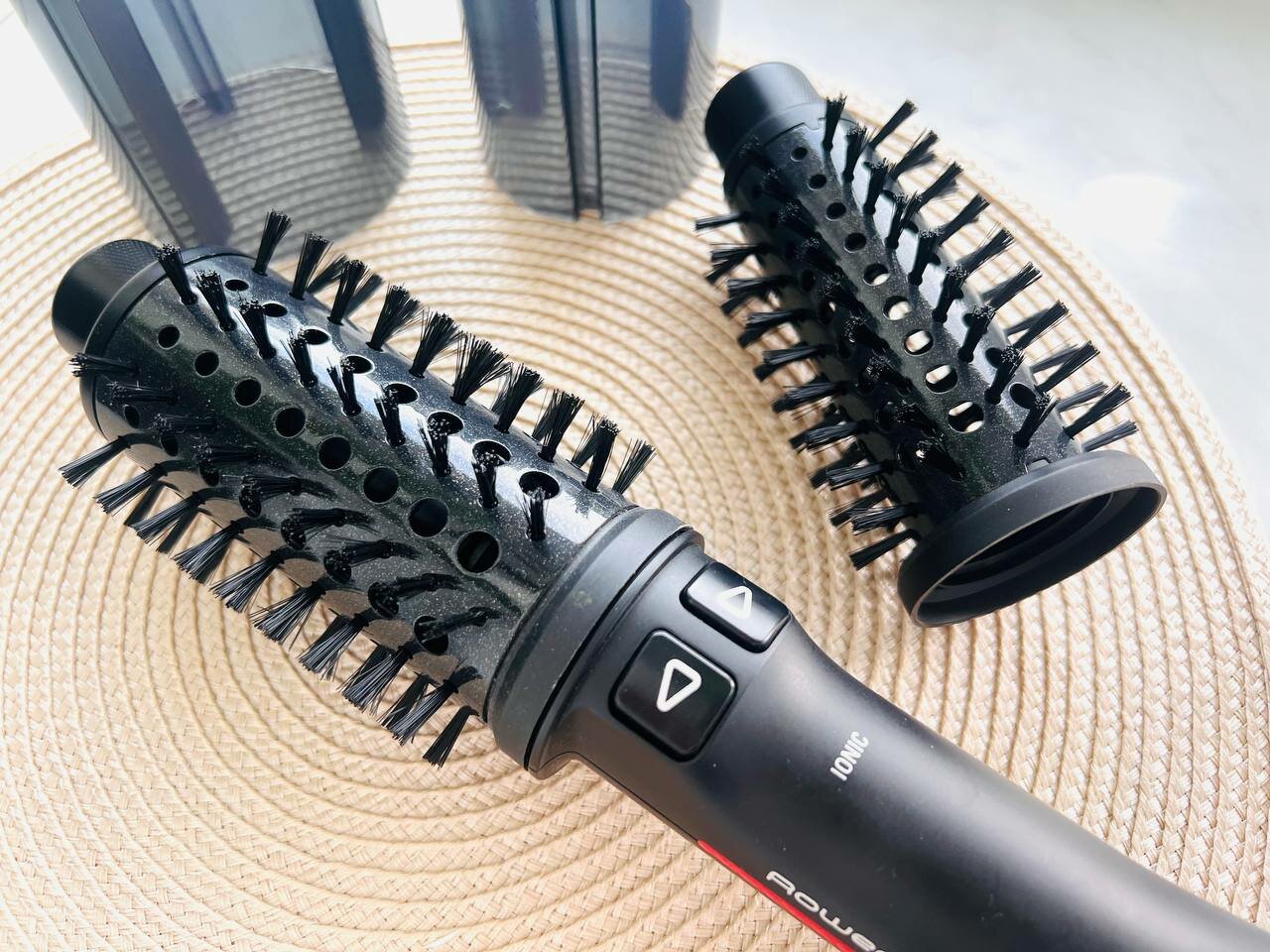 Фен-щётка интересная по дизайну, ничего лишнего. В руке лежит отлично - она не тяжёлая, рука не устаёт при сушке и укладке. Попробовала несколько насадок, всё понравилось. Отмечу, что меняются они легко, без лишних усилий