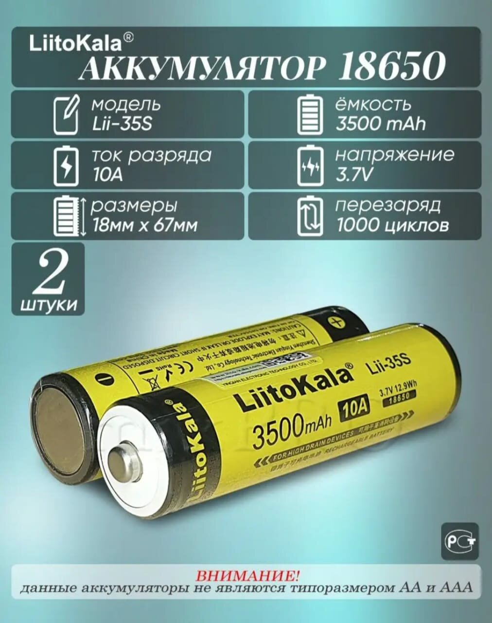 Аккумулятор 18650 (2 шт) LiitoKala Lii-35S 3.7V 3500 mAh с выпуклым плюсовым контактом / Литий-ионная батарея АКБ 18650 Li-ion 3.7В с емкостью 3500мАч