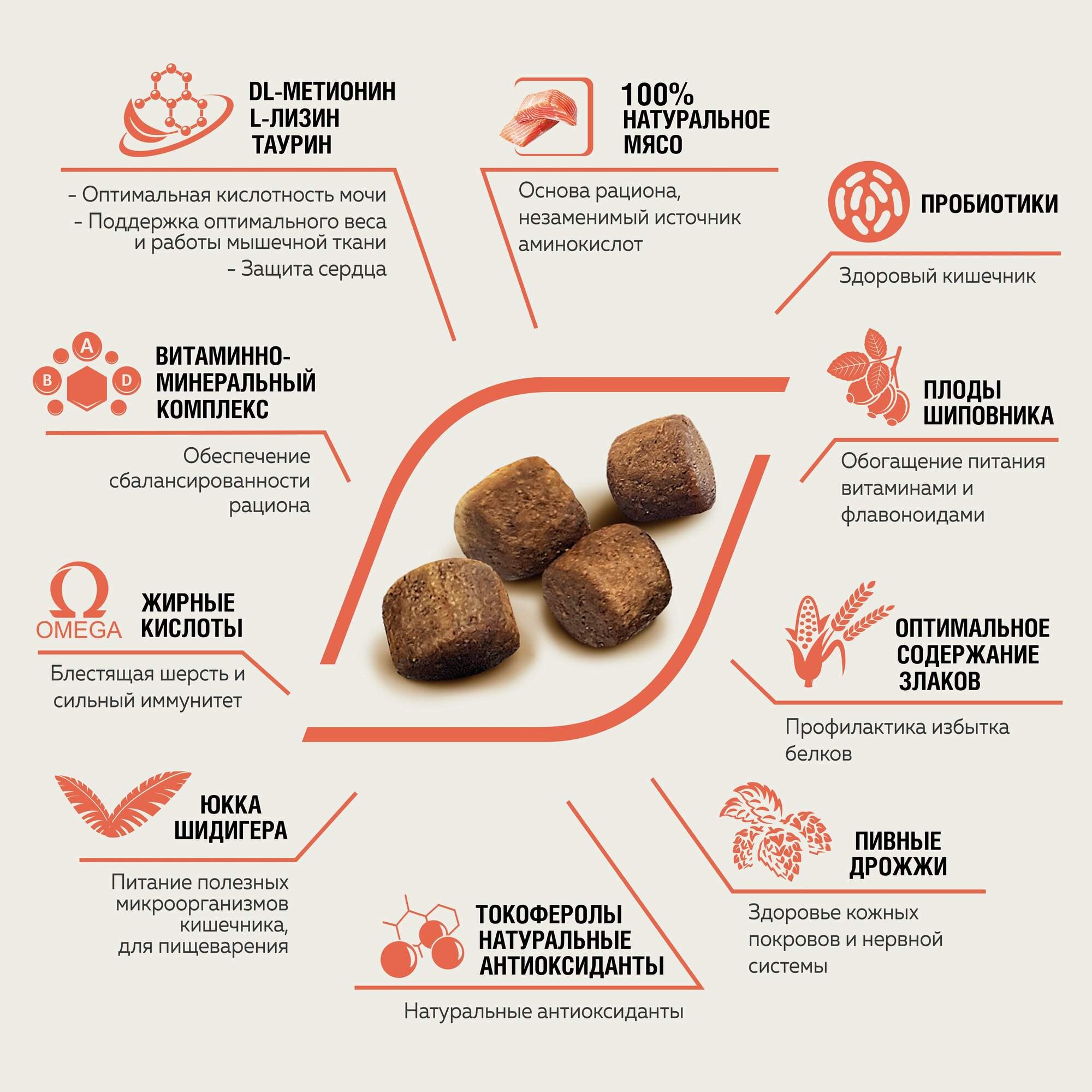 | Состав | дегидрированное мясо морской рыбы (в том числе лосось), мясо индейки, рис, жир птицы, кукуруза, гидролизованные мясные белки (вкусоароматическая добавка суперпремиум), отруби пшеничные, рыбий жир лососевый, дрожжи пивные, витаминно-минеральный комплекс (витамины: a, d3, e, b1, b2, b3, b4, b5, b6, b9 (фолиевая кислота), В12, Н (биотин) и микроэлементы: железо, медь, цинк, марганец, йод, селен, калий, магний, кобальт, натрий), пробиотики, таурин, DL-метионин, L-цистеин, L-лизин, плоды шиповника, экстракт юкки шидигера, антиоксиданты |