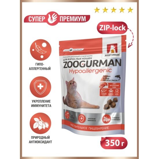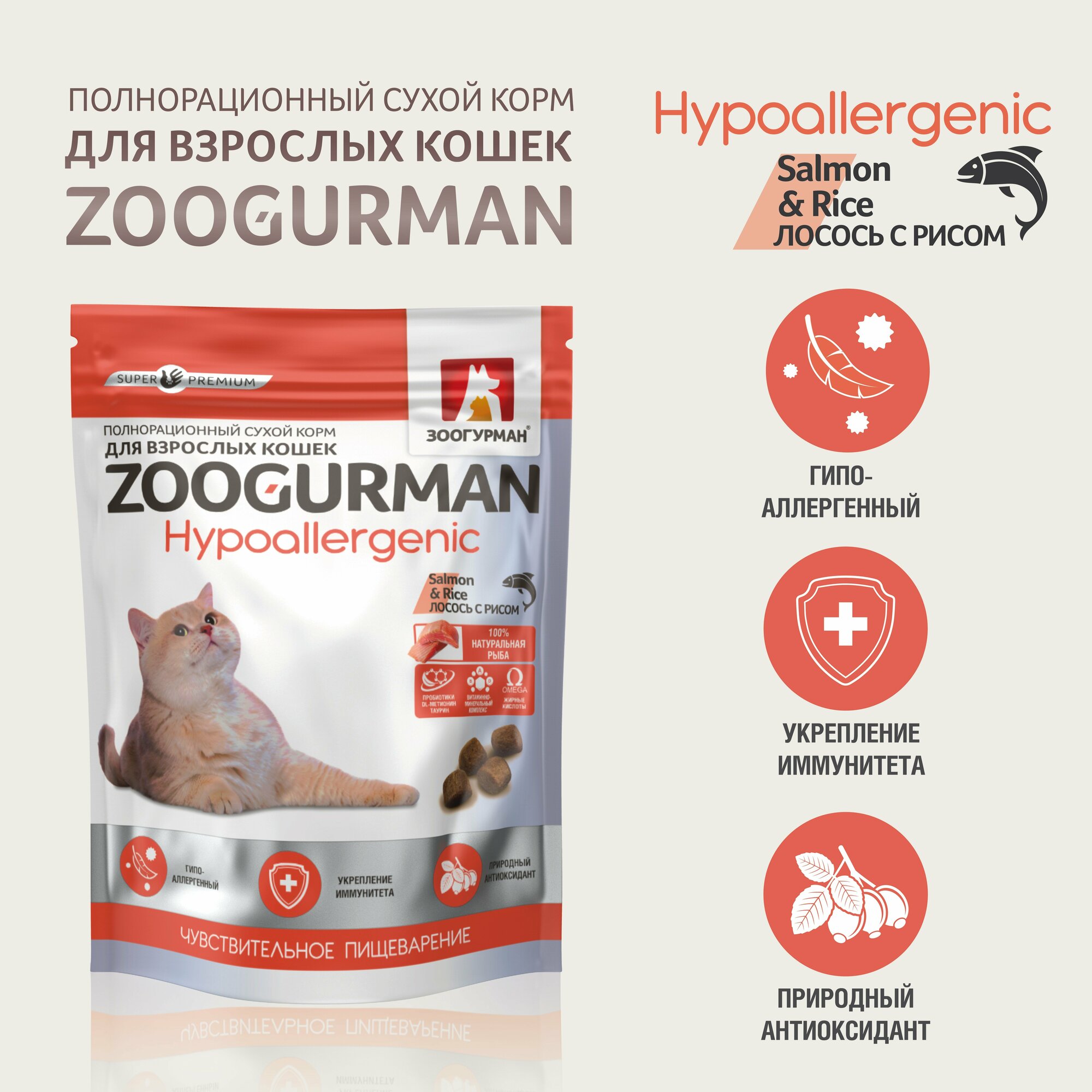 Полнорационный сухой корм для взрослых кошек Zoogurman Hypoallergenic, Лосось с рисом/Salmon & Rice 350 г