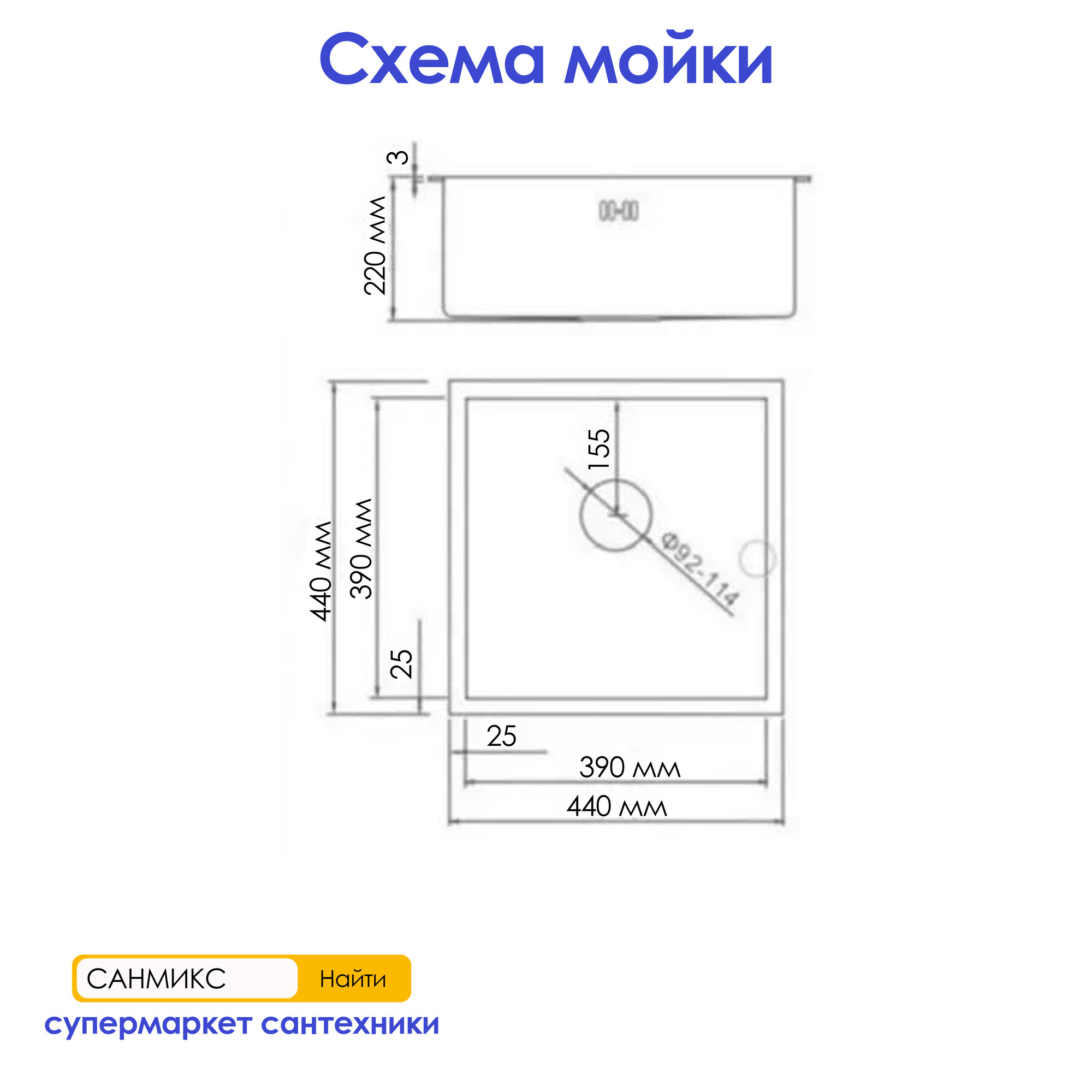 Мойка врезная нержавеющая сталь 44х44, толщ 3,0 мм, сатин, премиум AF94444