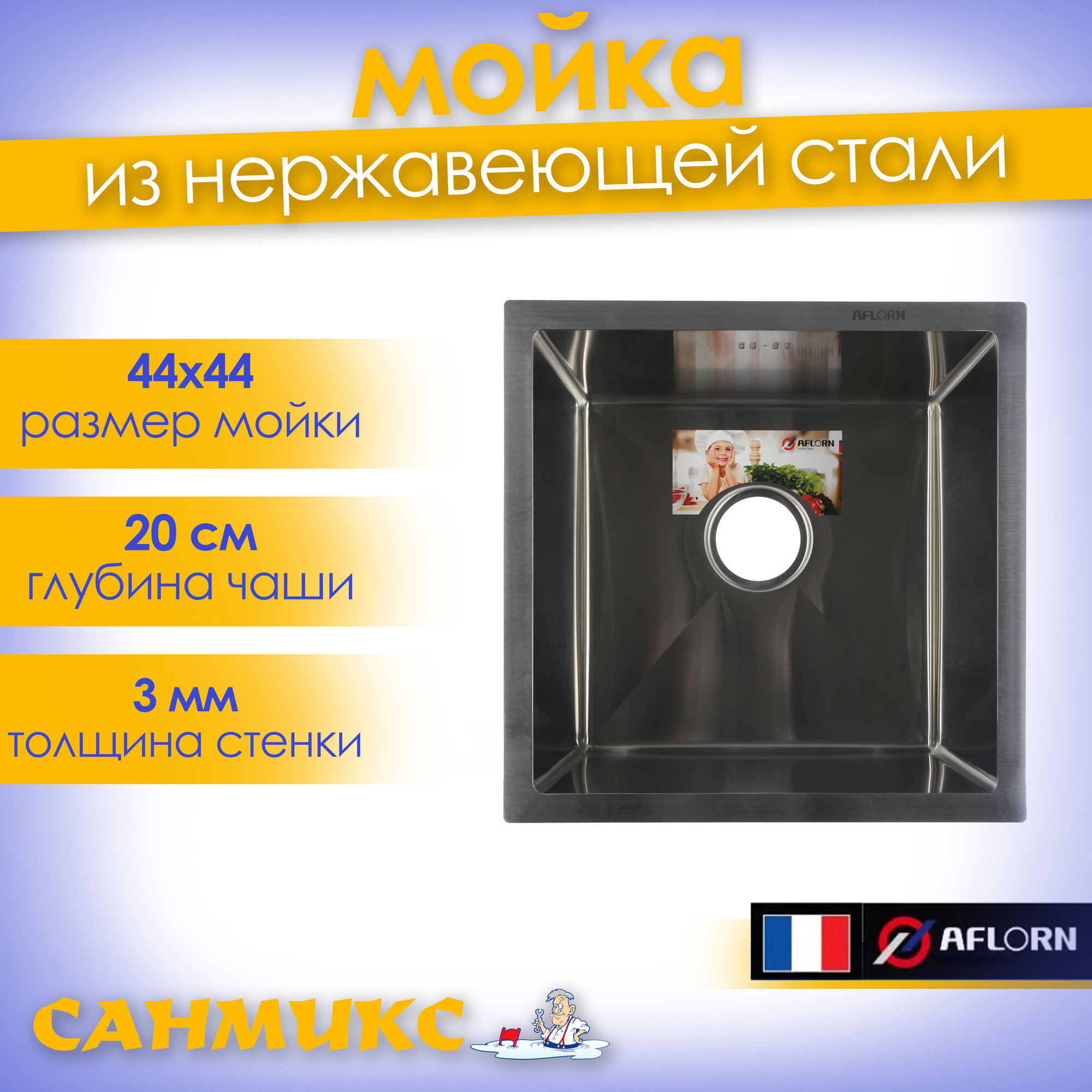 Мойка кухонная AFLORN AF94444, врезная, S=3,0 и 0,8 мм, 44х44х22 см, сифон, сатин