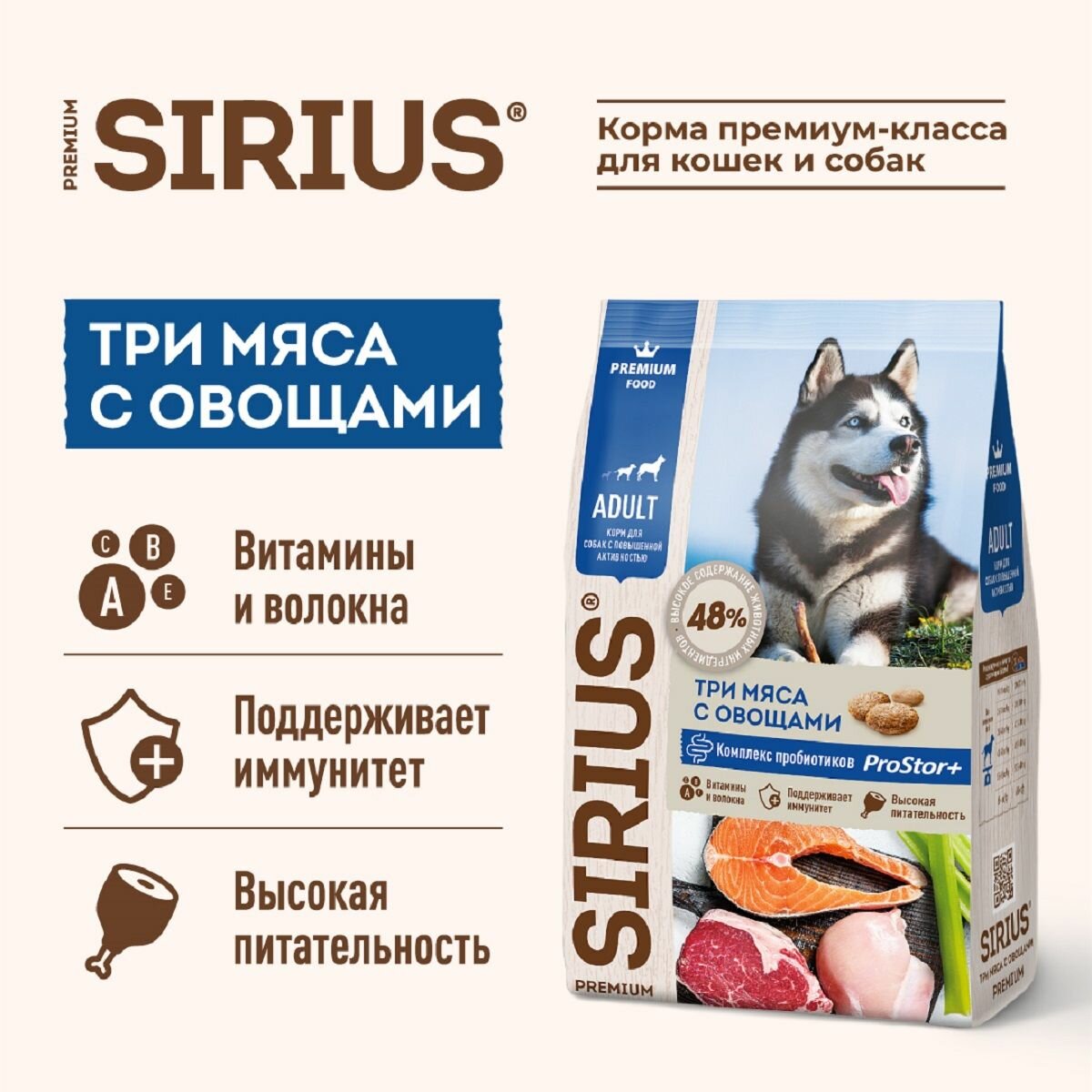 Сухой корм SIRIUS PREMIUM, Сириус для собак с повышенной активностью, три мяса с овощами, 2 кг