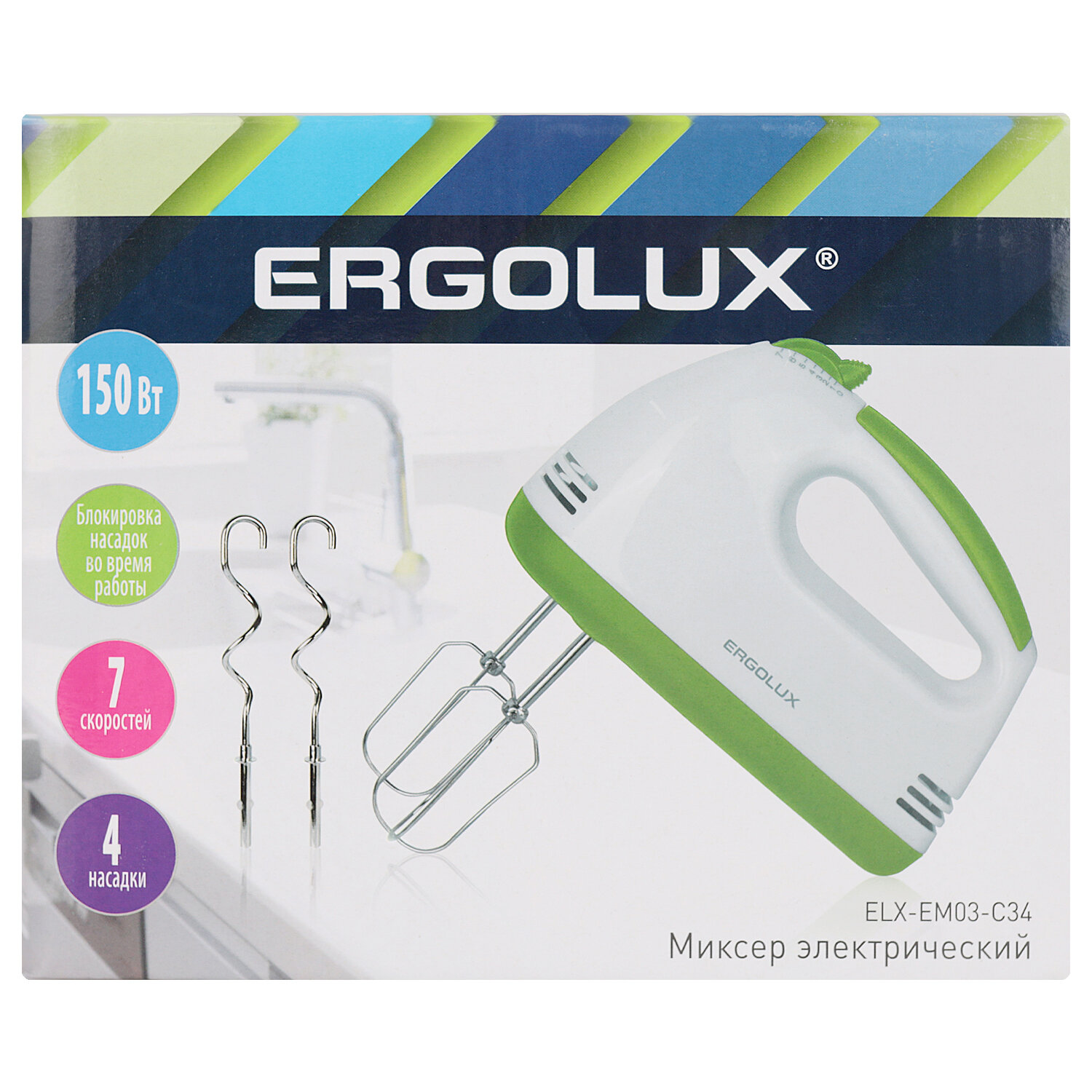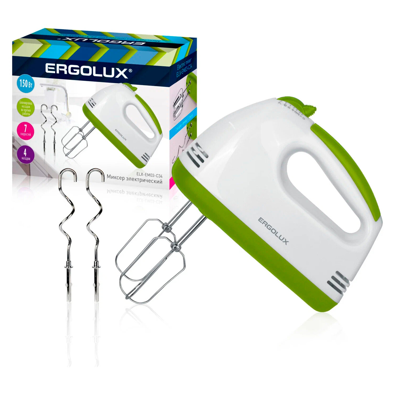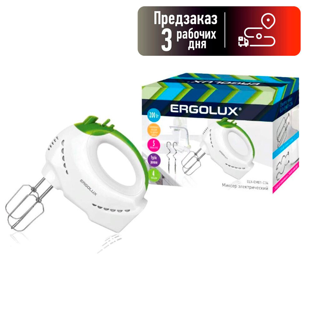 ELX-EM03-C34 бело-салатовый (миксер ручной 150 Вт, 220-240В), ERGOLUX 14935 (1 шт.)