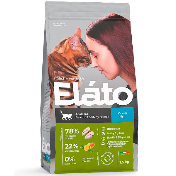 Сухой корм холистик Elato для взрослых кошек с рыбой, для красивой и блестящей шерсти кошек, 1,5кг.