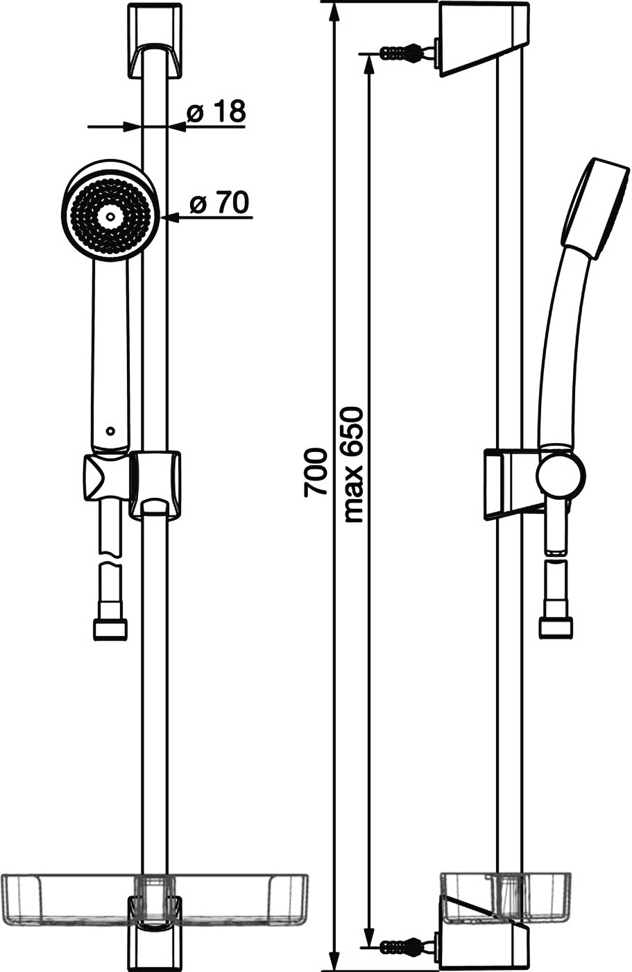 | Дополнительная информация | высота стойки для душа: 650 мм; диаметр душевой лейки: 70 мм |