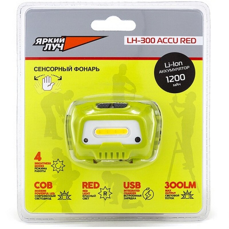 Фонарь Яркий ЛУЧ LH-300 Accu Red налобный COB 100/300лм +2реж. красн.диод, сенс.вкл., Li-Ion 1200mA