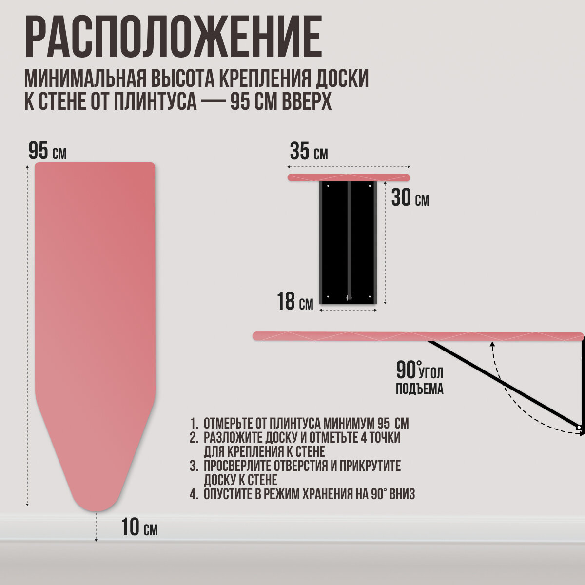 Гладильная доска настенная встраиваемая в шкаф с подрукавником, светло-розовый, 95х35 см
