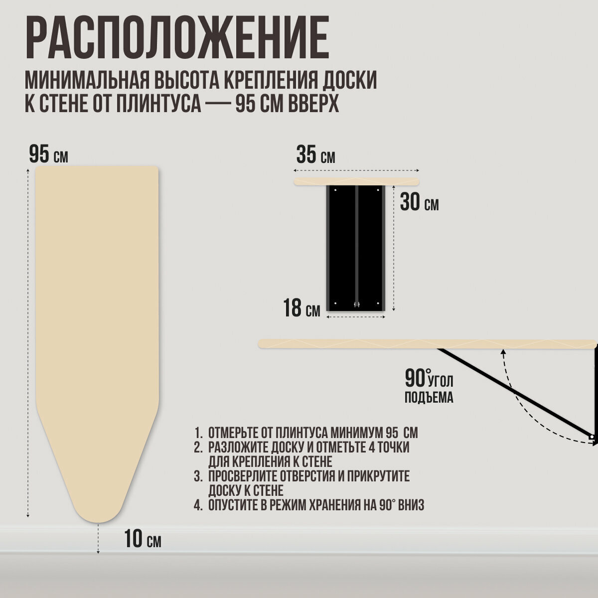 | Дополнительная информация | При монтаже доску можно скорректировать и установить на необходимой высоте, удобной для глажки белья с учетом роста. |