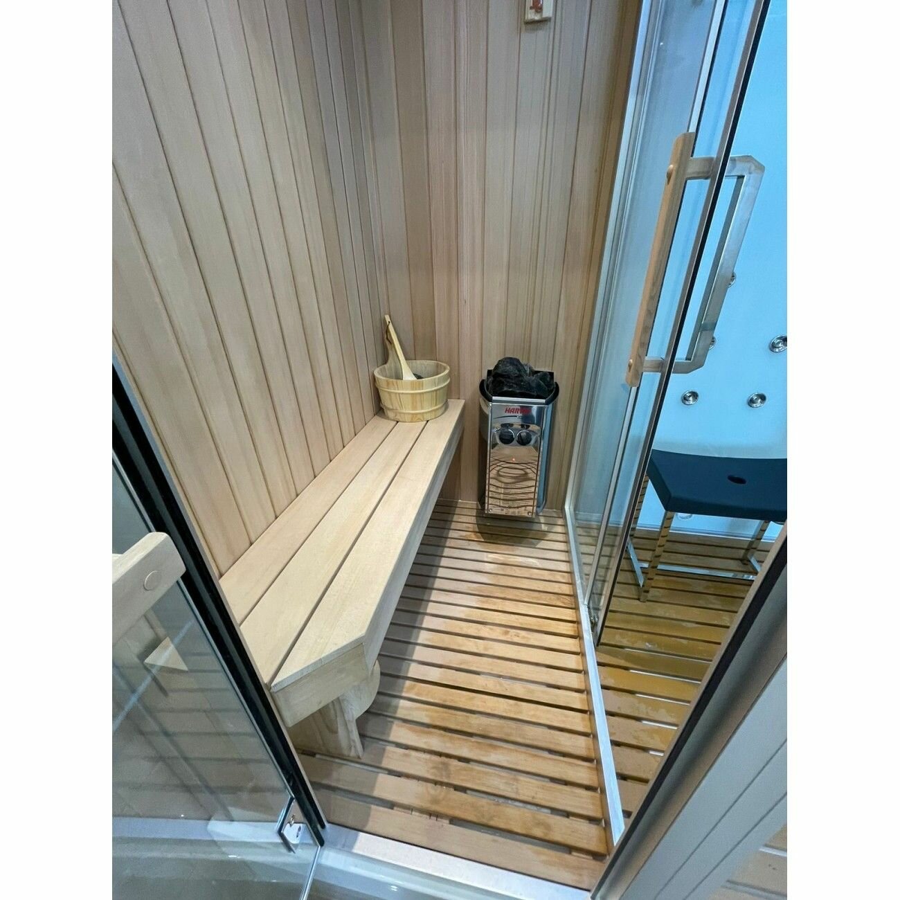 | Отзыв: | Кабина не маленькая, в ней удобно и уютно находиться. Можно свободно посидеть в парилке. Печка греет до 100 градусов. После сауны сразу в душ и воспользоваться гидромассажем. Советую! К сауне прилагаются все банные аксессуары. В общем для использования очень удобная. Нравится и очень! |