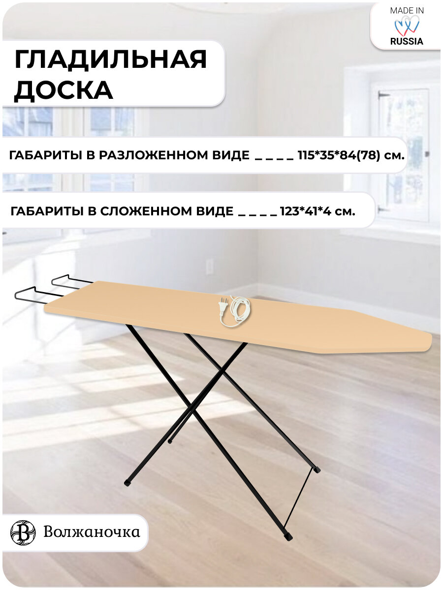 Доска гладильная Волжаночка , столешница 35 х 115 см, с подставкой под утюг, электроудлинителем с розеткой, цвет бежевый