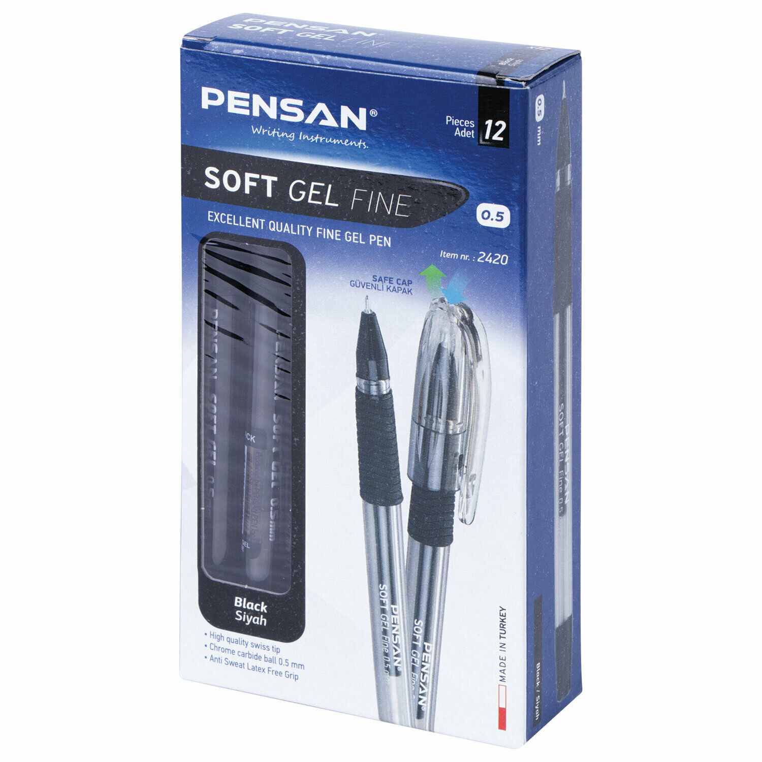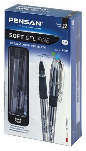 Комплект 12 шт. Ручка гелевая с грипом PENSAN Soft Gel Fine, черная, игольчатый узел 0,5 мм, линия 0,4 мм, 2420/12