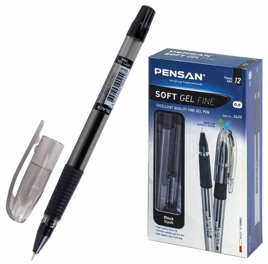 Ручка гелевая с грипом PENSAN Soft Gel Fine, черная, игольчатый узел 0,5 мм, линия 0,4 мм, (12 шт.)