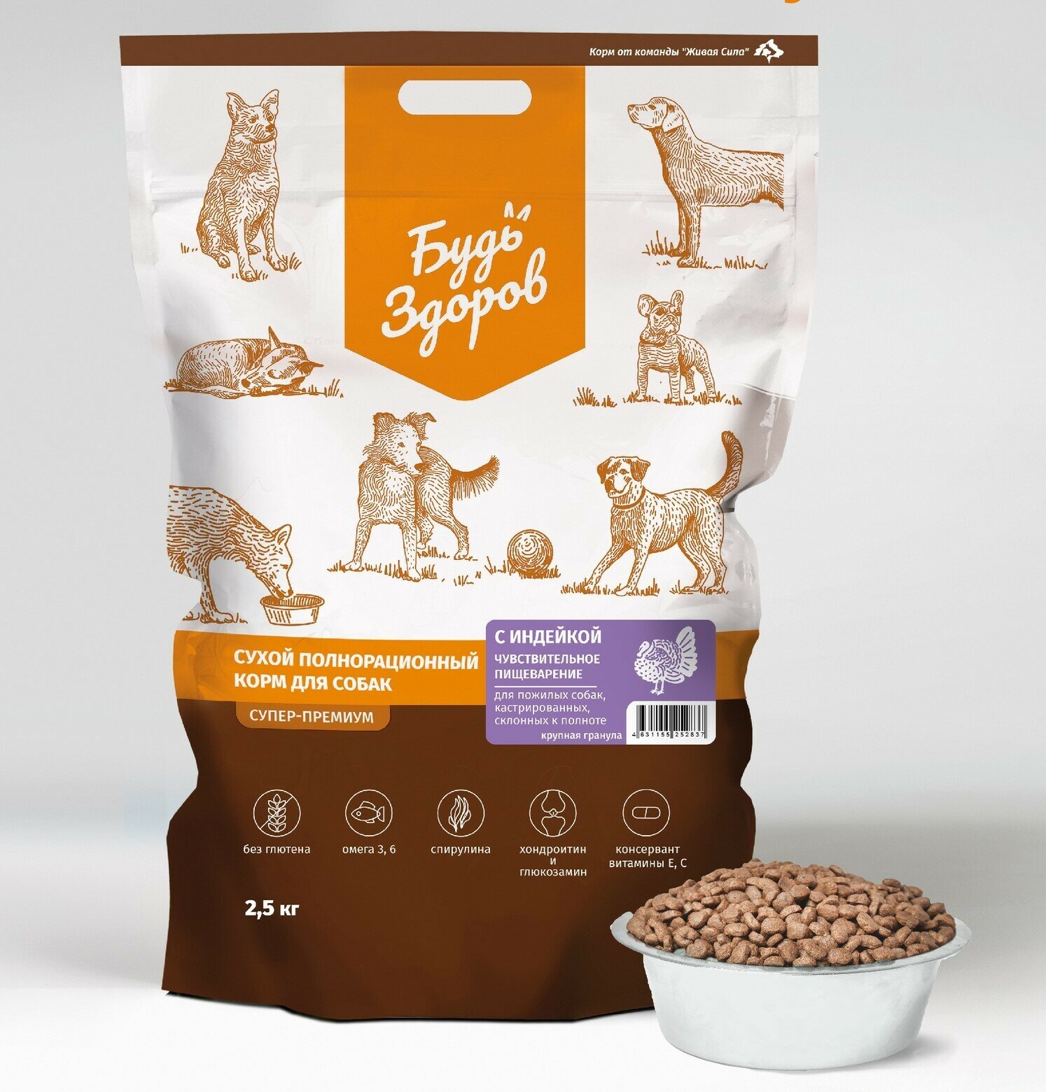 Будь ЗДОРОВ_ЖИВАЯ сила Корм для пожилых собак, кастрированных, склонных к полноте с индейкой, Крупная гранула (2,5 кг)