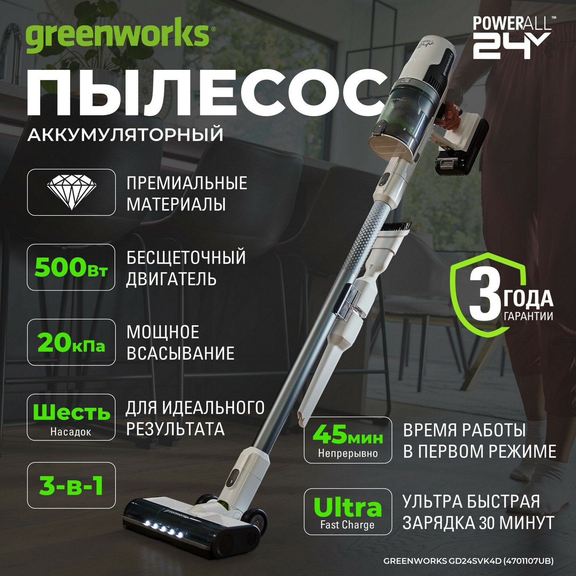 Пылесос беспроводной вертикальный аккумуляторный Greenworks 24В G24SVK4D, с АКБ 4 А*ч и ЗУ