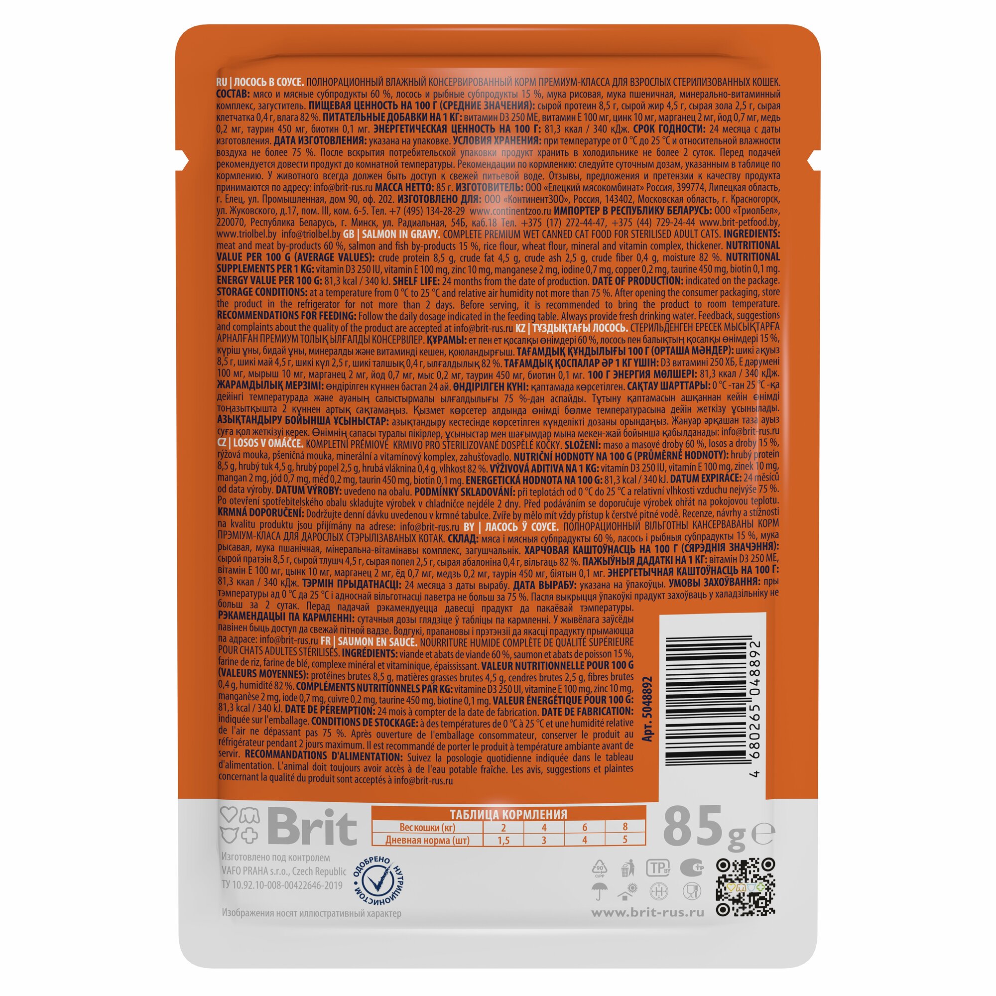 СохранитьВлажный корм Brit для стерилизованных кошек лосось в соусе premium 85г 5048892 интересное: