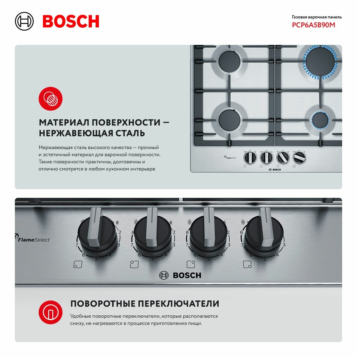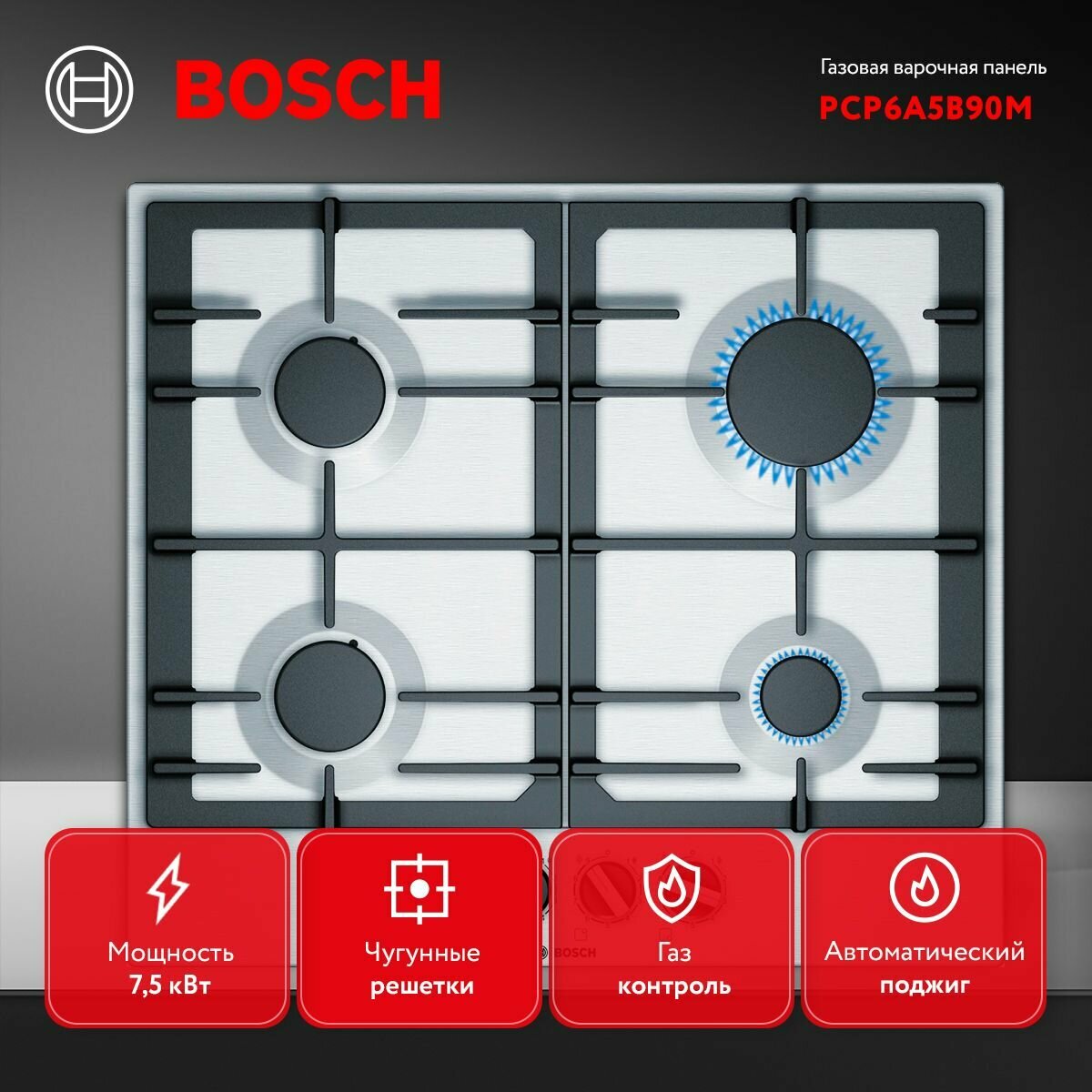 Встраиваемая газовая панель BOSCH PCP6A5B90M, серебристая