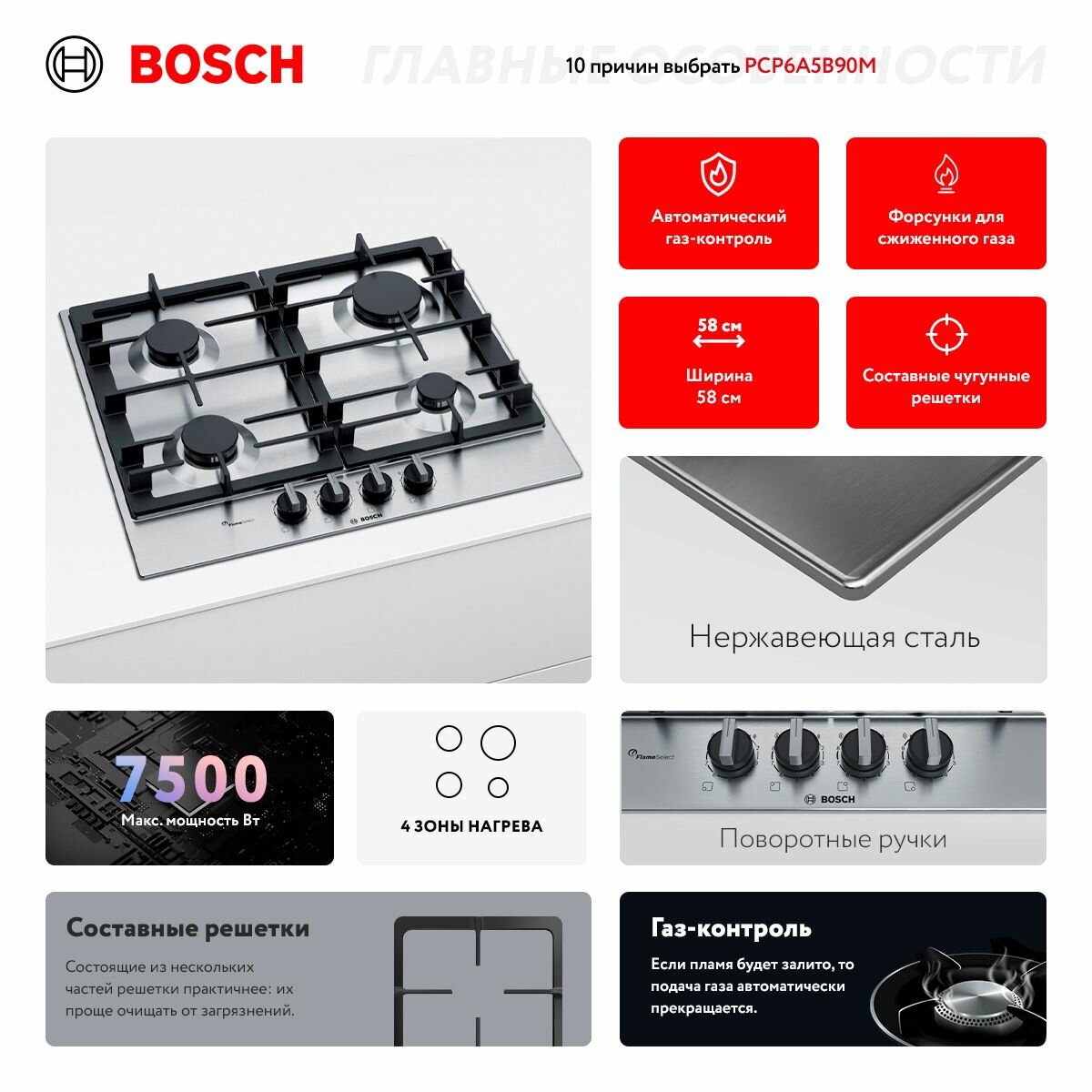 Встраиваемая газовая варочная панель Bosch PCP6A5B90M интересное: