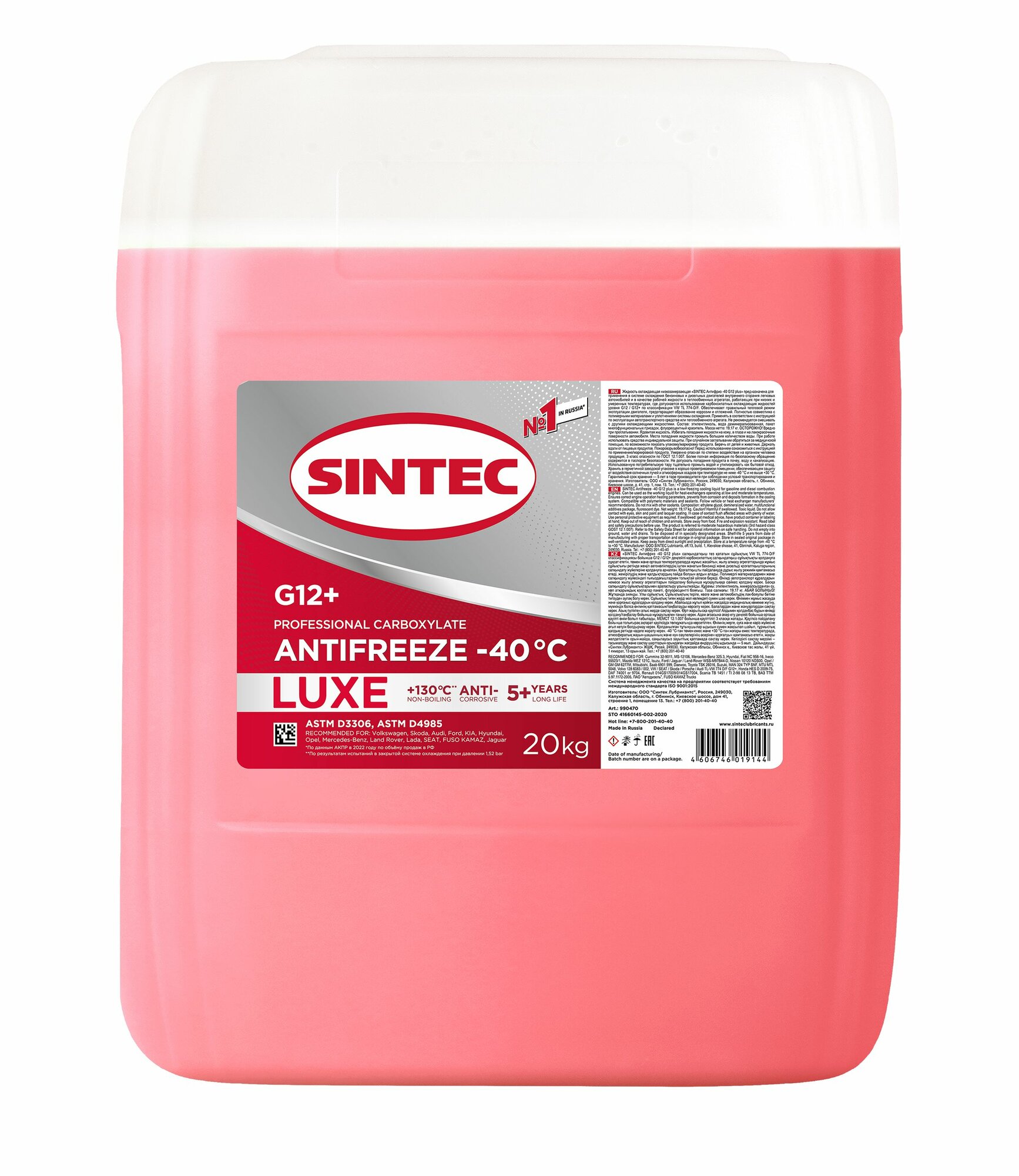 Антифриз Sintec Luxe (-40) 20Кг G12+ Красный SINTEC арт. 990470