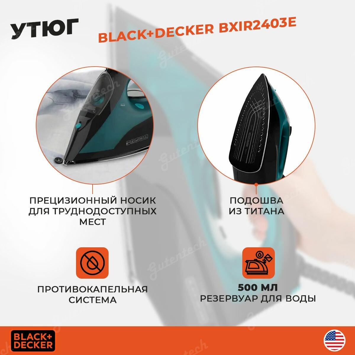 Утюг Black+Decker BXIR2403E / подошва из титана / контейнер для воды 500 мл / защита от накипи / черно-зеленый