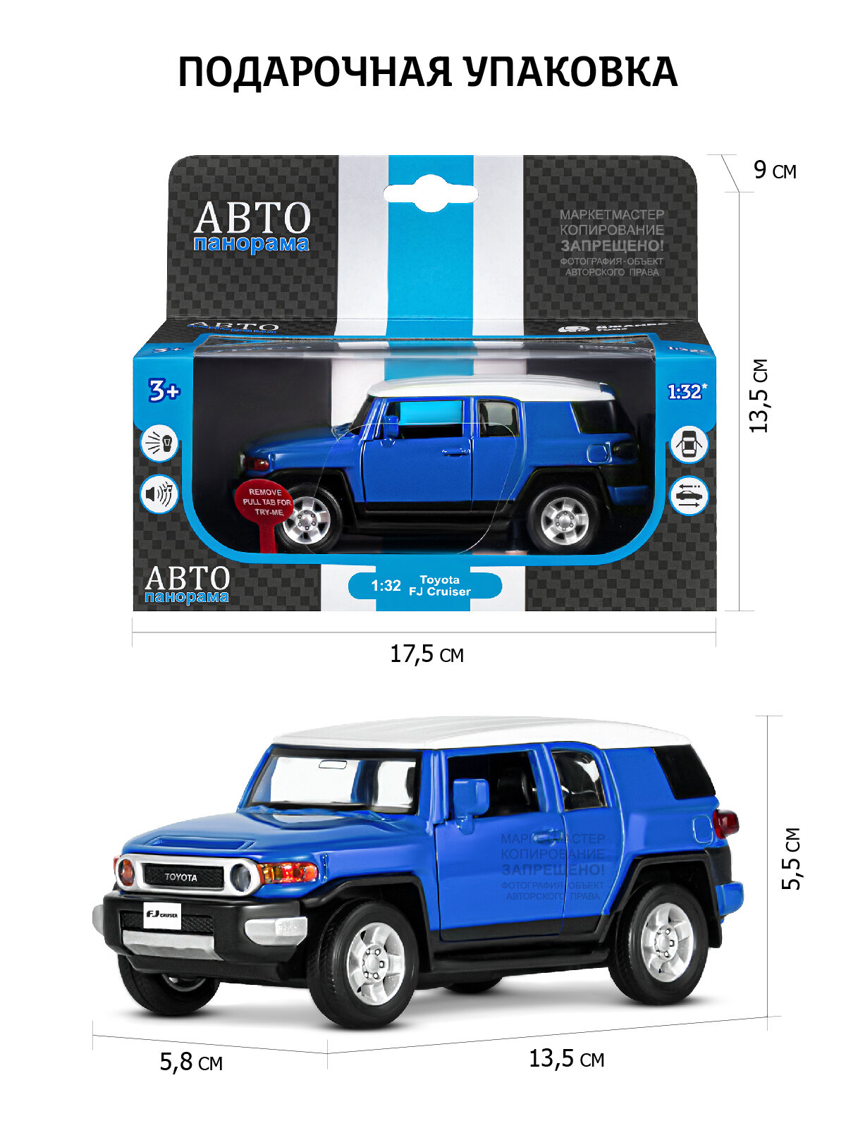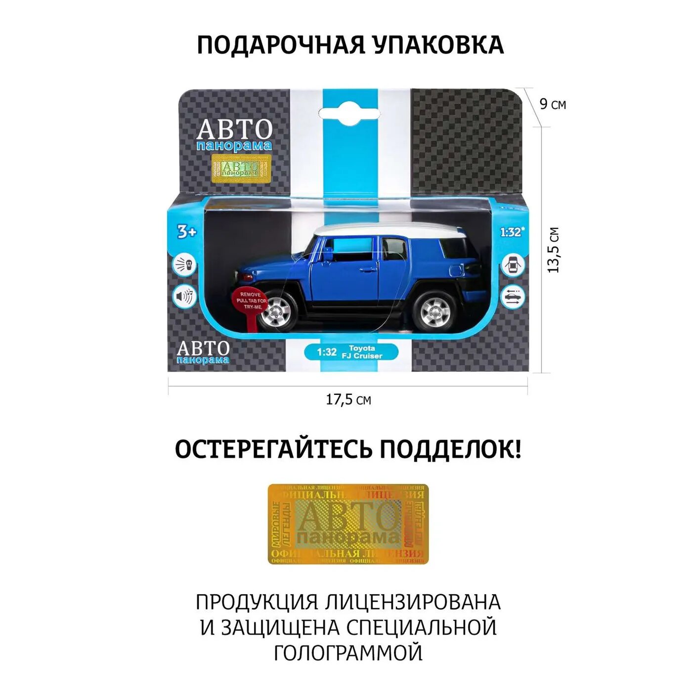 Машина "автопанорама" Toyota FJ Cruiser, синий, 1/32, свет, звук, инерция, в/к 17,5*13,5*9 см