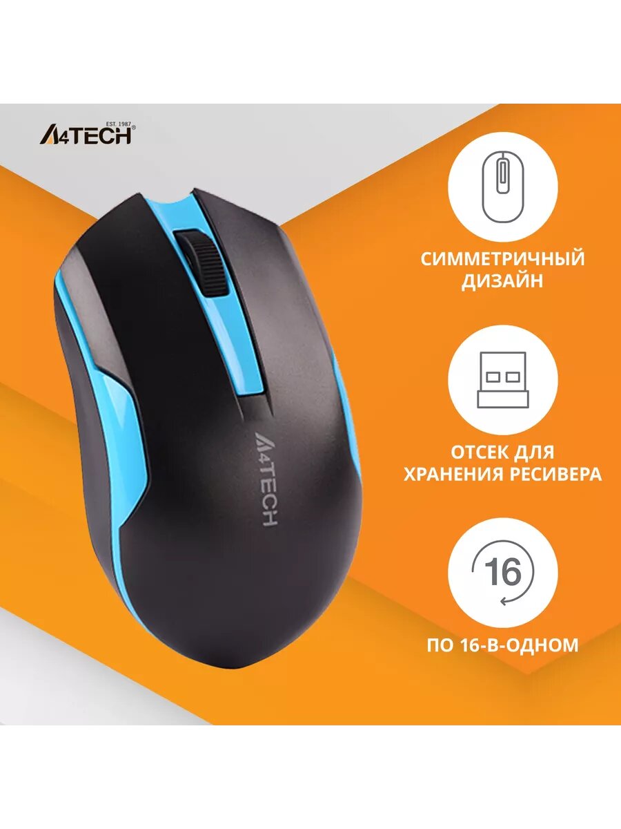 Мышь A4TECH G3-200N, оптическая, беспроводная, черный и синий