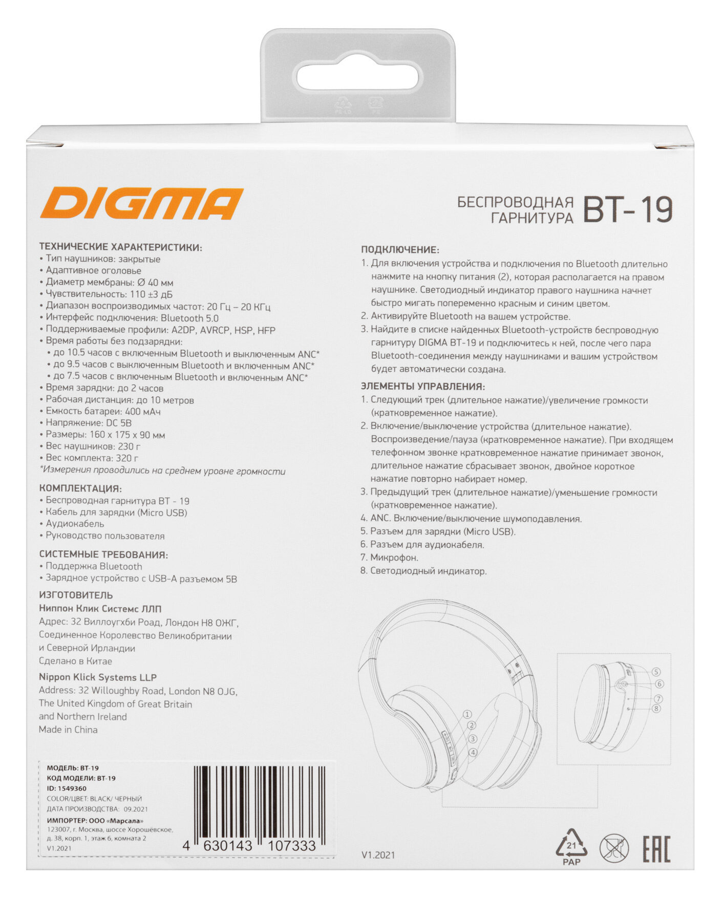 Наушники беспроводные Digma BT-19 ANC черный (bt19) .