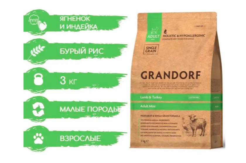 GRANDORF SINGLE GRAIN DOG ADULT MINI LAMB & TURKEY низкозерновой для взрослых собак маленьких пород с ягненком и индейкой (3 кг)