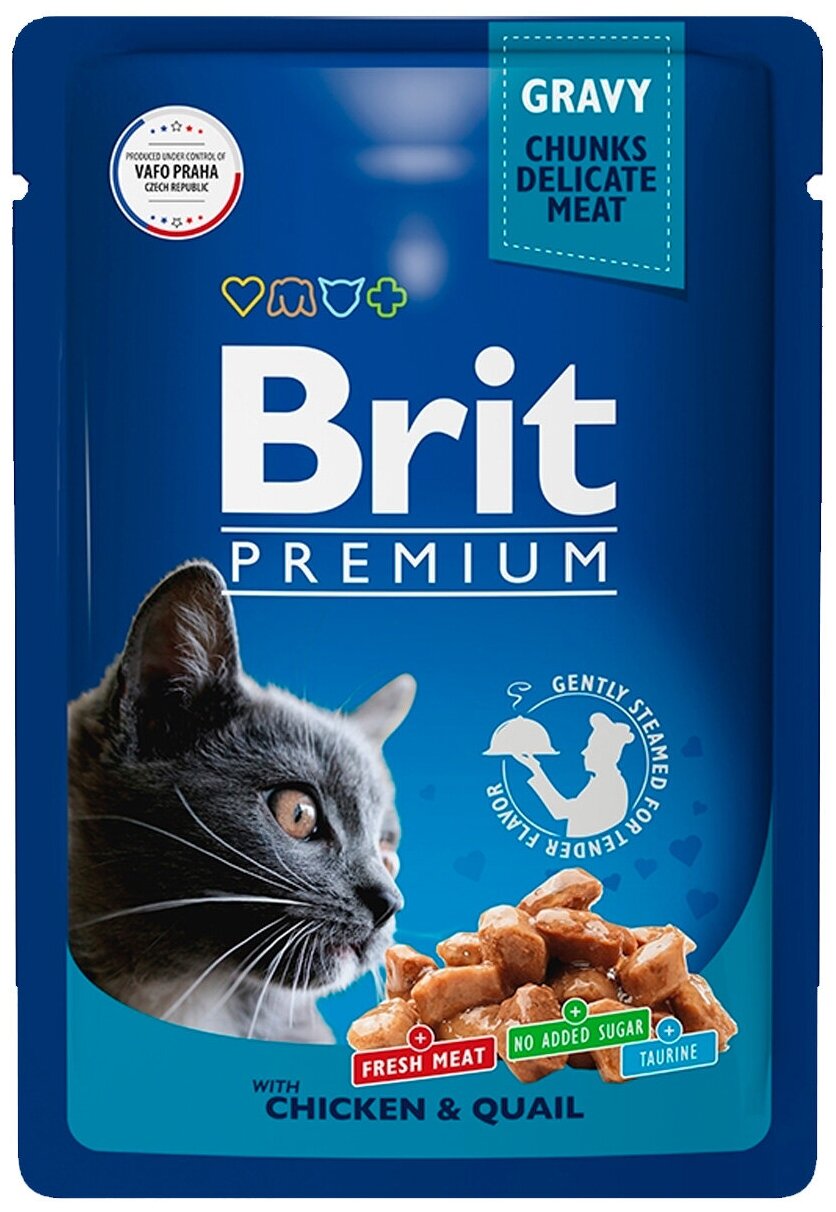BRIT PREMIUM, влажный корм для кошек. Пауч для взрослых кошек, Цыпленок и Перепёлка в соусе, 85г