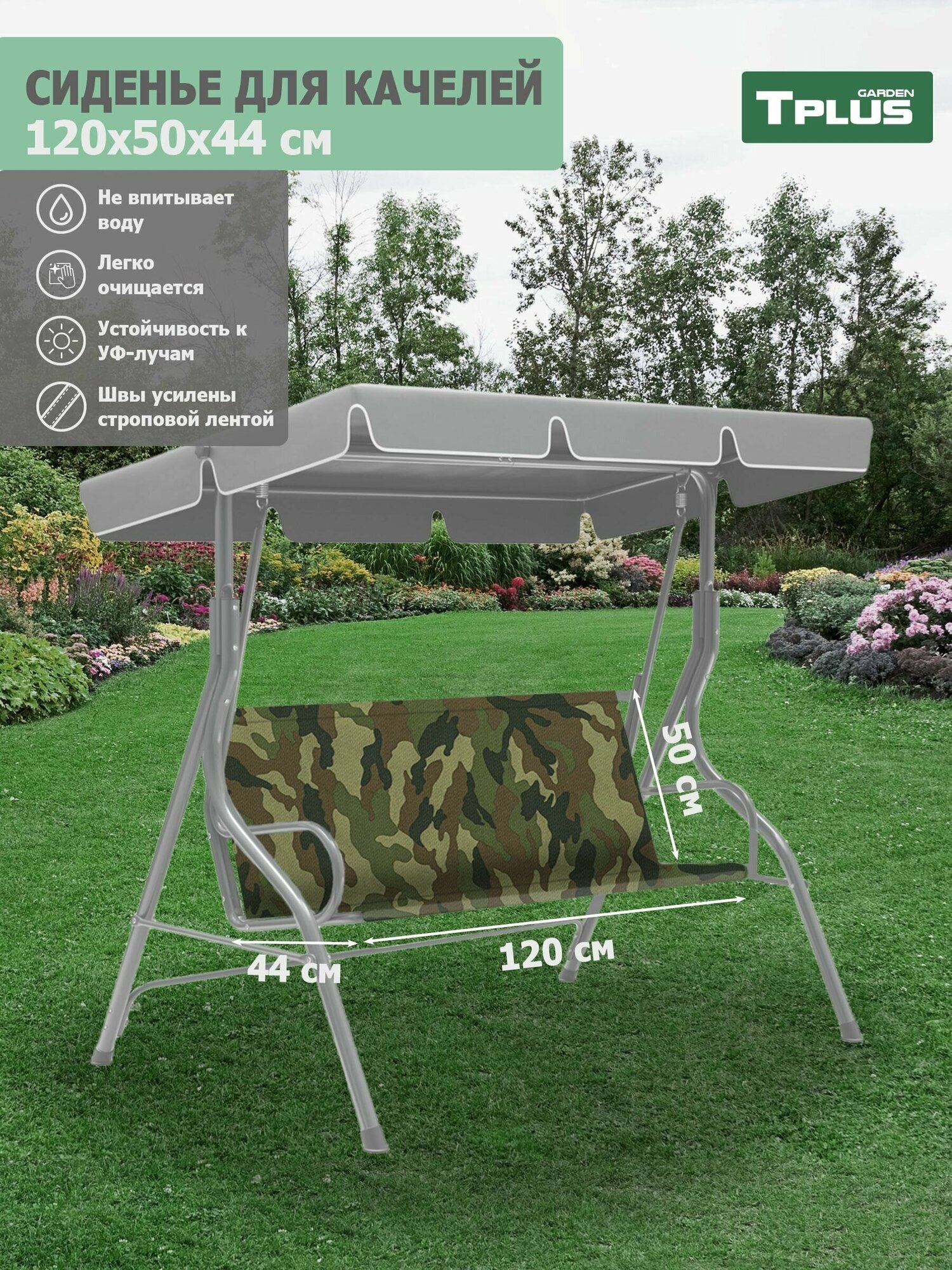 | Состав комплекта | Сиденье для качелей садовых 1300x500/440 мм. (оксфорд 600, multicam), Tplus |