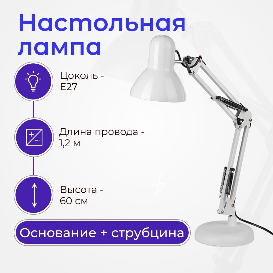 Настольная лампа цвет белый, мощность светильника 60Вт, Е27, высота 60 см подставка+струбцина в комплекте