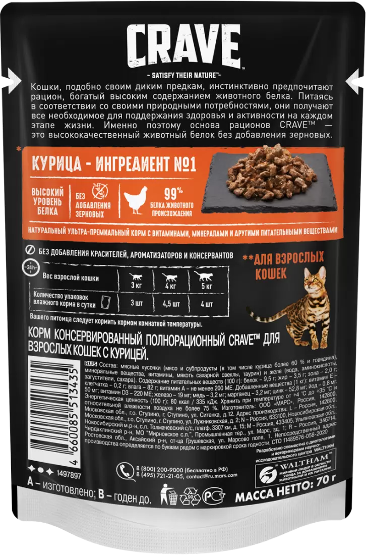Crave корм влажный пауч для кошек Курица 70г (30штук) интересное: