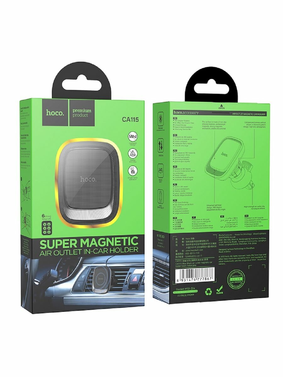 Автомобильный держатель для телефона HOCO CA115 Blue Shark, магнитный, на воздуховод, черный