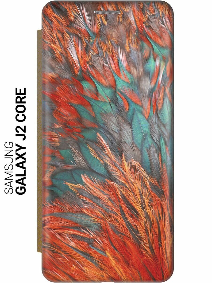 Купить Чехол-книжка на Samsung Galaxy J2 Core, Самсунг Джей 2 Кор c принтом "Разноцветные перья" золотистый