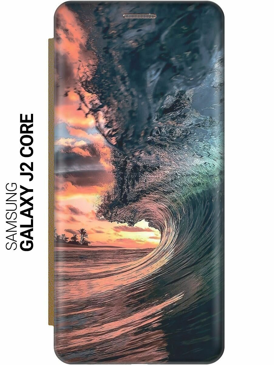 Чехол-книжка на Samsung Galaxy J2 Core / Самсунг Джей 2 Кор c принтом "Волна на закате" золотистый