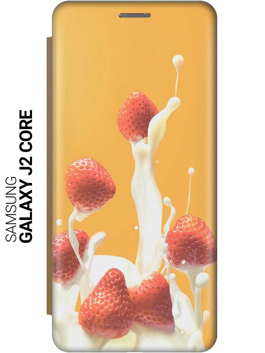 Чехол-книжка на Samsung Galaxy J2 Core / Самсунг Джей 2 Кор c принтом "Клубника и сливки" золотистый