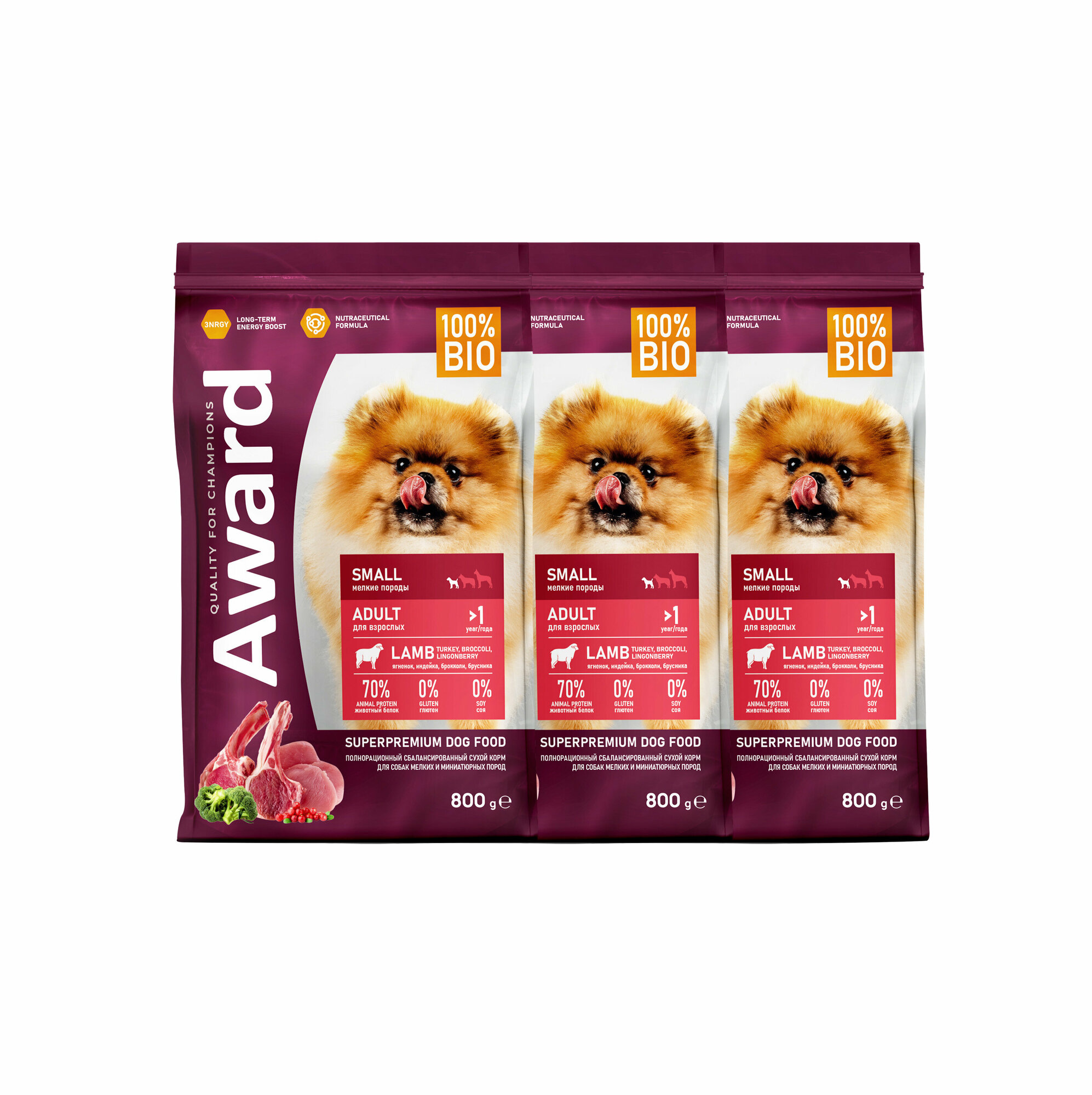 Купить Сухой корм AWARD для взрослых собак мелких и миниатюрных пород с ягненком и индейкой с добавлением брокколи и брусники 800г х 3 шт.