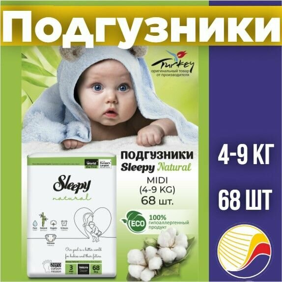 ЭКО Подгузники детские Sleepy Natural размер 3 (4-9кг.) 68 шт интересное: